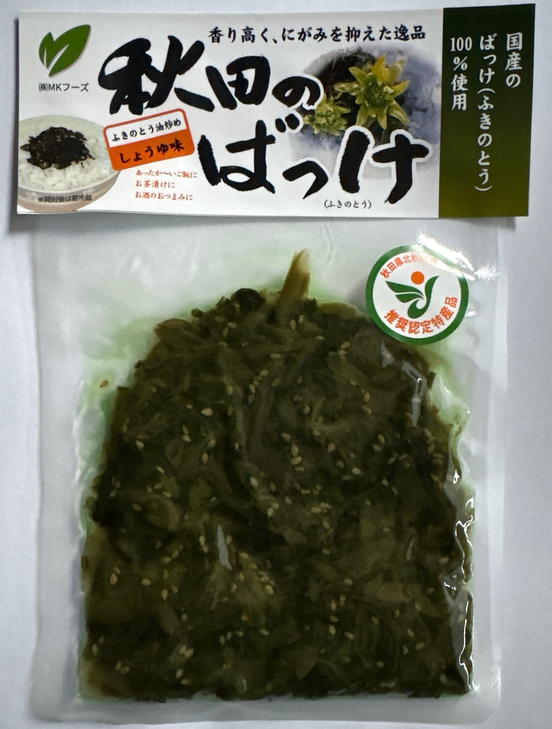 原材料名:ふきのとう(国産)、醤油、砂糖、食用植物油脂、植物たん白加水分解物、胡麻、ごま油、発酵調味料、かつおだし(かつお節エキス、かつお節、こんぶ、しいたけエキス、でん粉、酵母エキス、麦芽糖)、唐辛子、調味料(アミノ酸等)、酸味料